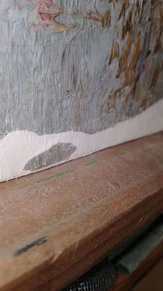 Cuando reintegramos una laguna, tan importante es el color como el estuco. Para pinturas muy matéricas, como este lienzo impresionista belga, le damos al estuco un poco de textura que ayude a integrar mejor la laguna.